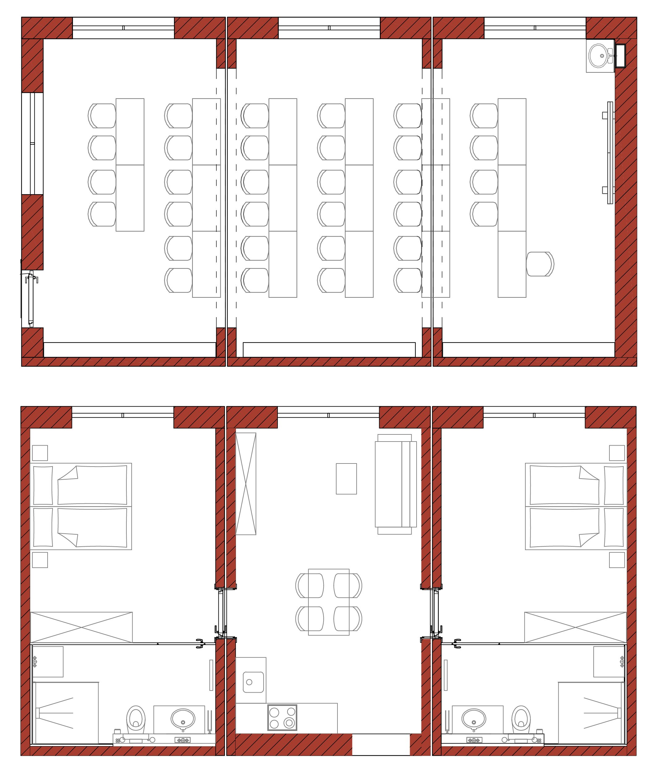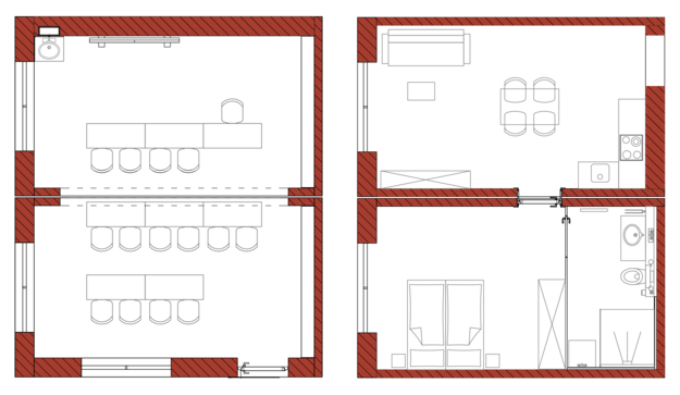 Durch das fast komplette Weglassen der Innenwände (Längsseiten) der Ziegel-Module können einzelne, 25 m² große Moduleinheiten nun zu größeren Räumen verbunden werden.