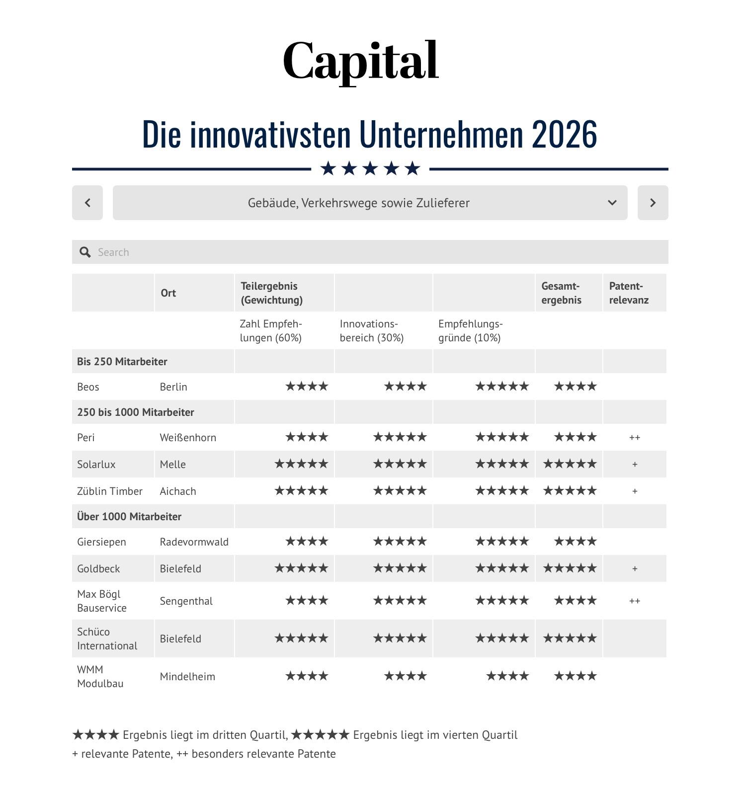 Zum siebten Mal zeichneten Capital und Statista die innovativsten Unternehmen Deutschlands aus. 503 Firmen sind 2026 in die Liste der „Innovativsten Unternehmen Deutschlands“ gelistet worden. WMM Modulbau wurde im Bereich „Gebäude, Verkehrswege, Zulieferer“ als eines von neun Unternehmen in ganz Deutschland auf Anhieb in die „Best-of“-Liste aufgenommen und für den innovativen Ziegel-Modulbau ausgezeichnet.
